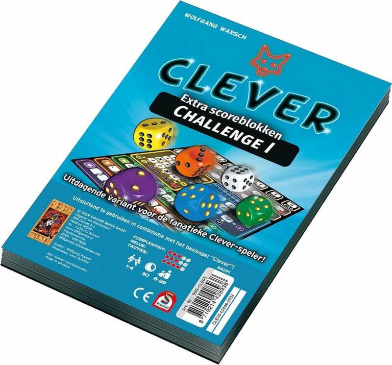 Voor de doorgewinterde dobbelaar die het scoreformulier van Clever kan dromen is er het Clever Challenge scoreblok. Kleine wijzigingen in de lay-out bieden tal van nieuwe mogelijkheden om die topscore te halen. Het Challenge scoreblok heeft verder precies dezelfde regels als het normale spel, maar de bonussen en voorwaarden op het blaadje zijn anders. Maak je klaar om de dobbelsensatie Clever te herontdekken!