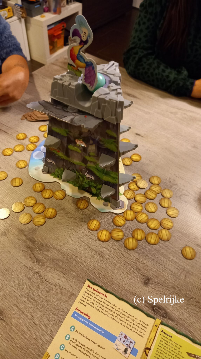 De heilige dodo van de Hagulaminapitopasi-stam legt ieder jaar op de top van een berg een ei. Dit ei rolt tergend langzaam richting de afgrond. Samen met je medespelers zet je alles op alles om het ei te redden. Dit doe je door bruggen te bouwen, die ervoor zorgen dat het ei veilig en wel naar een boot aan de voet van de berg rolt. Maar als jullie te langzaam zijn, valt het ei te pletter! In dit hilarische geheugen- en actiespel moet je samen zo snel mogelijk genoeg fiches vinden om bruggen op de berg te zetten. Dit doe je door met een dobbelsteen te rollen en het juiste bijhorende fiche onder alle gedekte fiches te vinden. Alleen als je onthoudt welke fiches waar liggen, kun je op tijd de bruggen in elkaar zetten. Dodo is een race tegen de tijd. Het wiebelende ei heeft namelijk een eigen willetje. Soms kruipt het ei met een slakkengang de berg af. En soms rolt het ei ineens met een rap tempo bijna een brug af. Weten jullie het ei op tijd te redden?