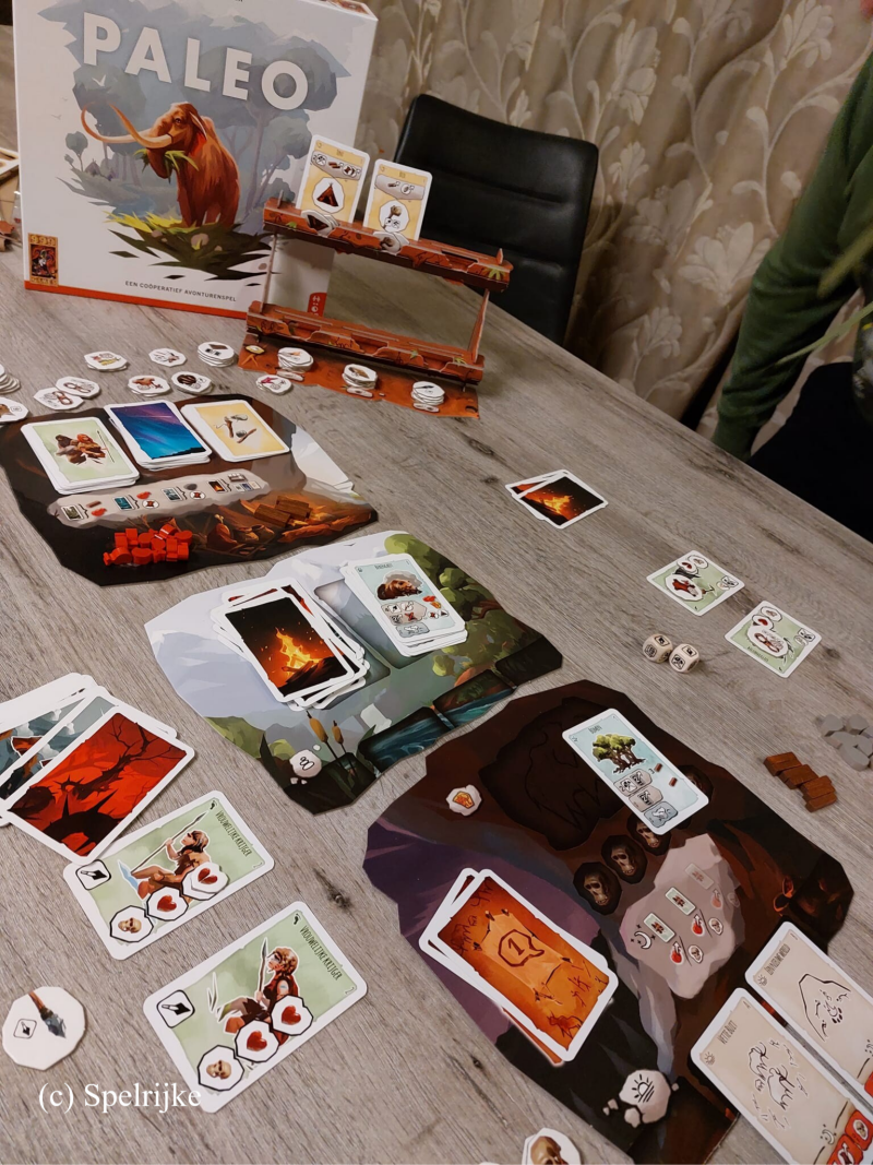 In het stenen tijdperk is het eten of gegeten worden. In het coöperatieve spel Paleo proberen jullie als volksstam samen te overleven en voortdurend te streven naar vooruitgang. Maar let op, overal dreigt gevaar: wilde dieren, stormen en andere volksstammen liggen op de loer. Zullen jullie slagen? In Paleo speelt elke speler met een groep mensen uit de stam. Daartoe behoren onder andere stoere vrouwelijke krijgers, handige uitvindsters en waakzame verkenners. De spelers vormen samen een volksstam en proberen de omgeving te verkennen. Dat leidt tot telkens nieuwe avonturen. Die kunnen de spelers alleen overleven door goed samen te werken. Elke speler krijgt een eigen stapel kaarten, die zowel de te verkennen omgeving als de daarvoor beschikbare tijd voorstellen. In Paleo draait alles om het ontdekken van nieuwe dingen en er staan de spelers dan ook voortdurend nieuwe uitdagingen te wachten! Met tien verschillende modules die op verschillende manieren gecombineerd kunnen worden, is geen enkel potje hetzelfde. Zullen jullie er in slagen om te overleven en de grotschildering af te maken om zo jullie stempel op de geschiedenis te drukken?