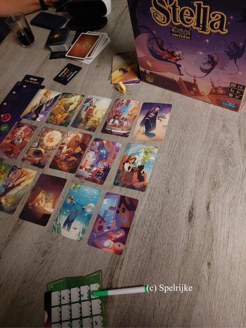 In het competitieve kaartspel Stella - Dixit Universe moeten spelers beelden interpreteren naar aanleiding van een gemeenschappelijk woord. Kies dezelfde kaart als de andere spelers om te winnen! Je moet risisco nemen, maar ook oppassen dat je niet in de val wordt gelokt. Heb jij het lef om de sterren achterna te jagen?